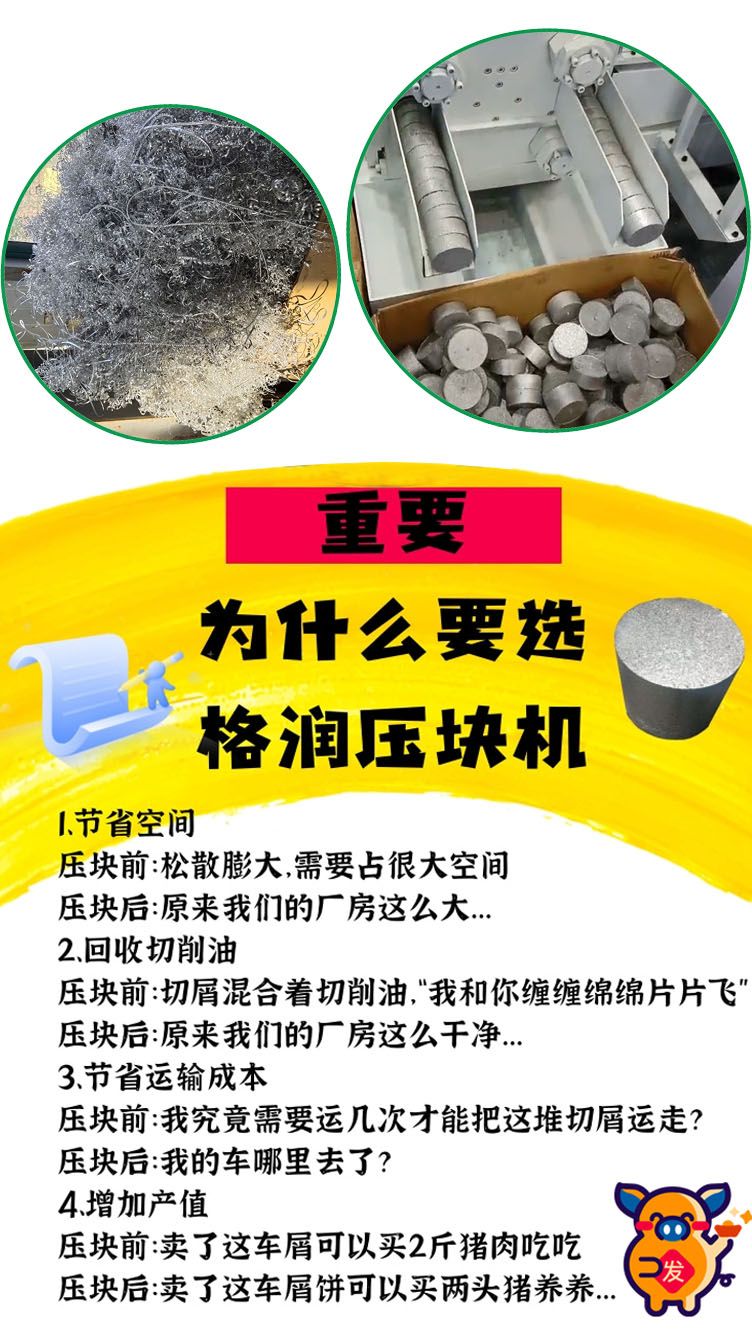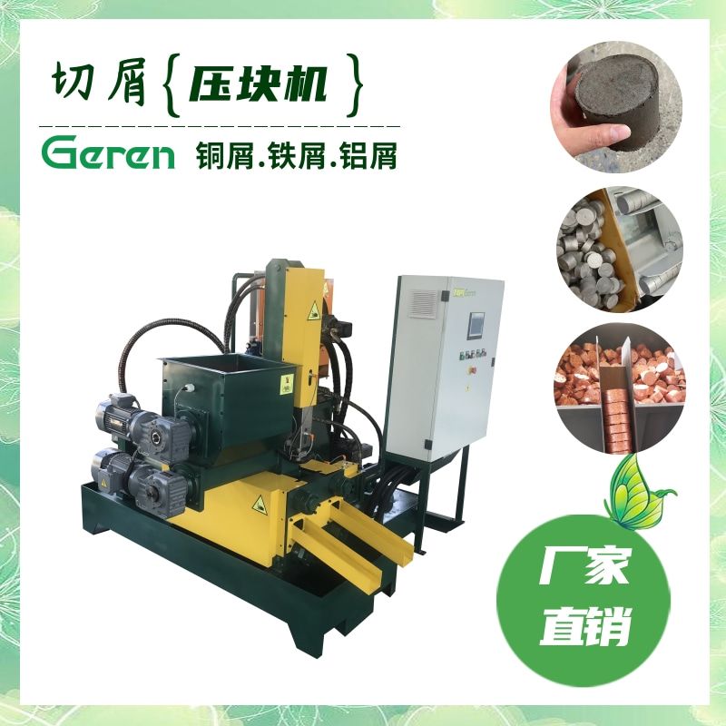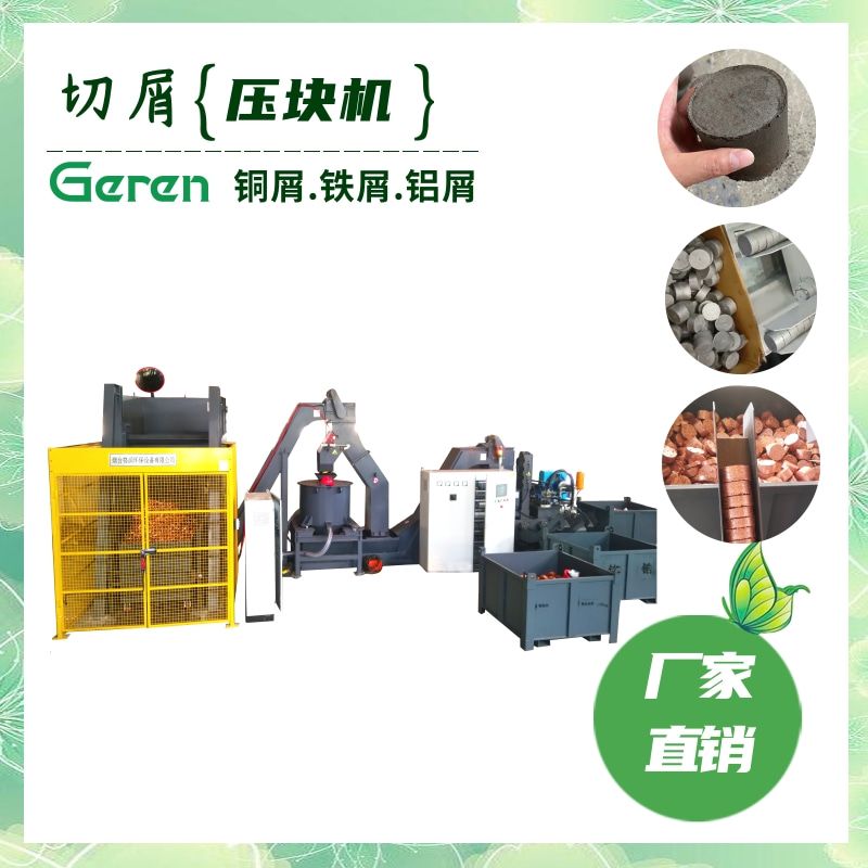 在进料方式上,我们研制了特殊的进料方式,所以使得各种各样形状的切屑能够顺利的压入到填料位置。从而解决了以前作业中出现的切屑堆缠绕、填不进送料的问题。在压缩体积上,铜屑、铝屑的压缩比一般为二十 分之一,钢屑的压缩比为十五分之一, 铸铁屑的压缩比一般为五分之一 。